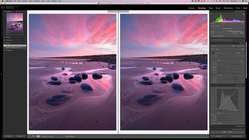 You can see that there has been a colour shift towards magenta in the proof, and the proof has become slightly darker and lacking in contrast compared to the original. To match the proof to the original, I’ve made adjustments in the Tone panel to Exposure, Contrast, Highlights, Shadows, Blacks and Clarity.